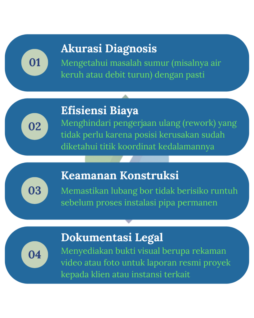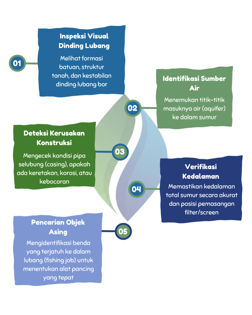 Borehole Camera adalah teknologi inspeksi visual yang dirancang khusus untuk melihat kondisi di dalam lubang bor, sumur dalam, atau pipa vertikal secara real-time. Bayangkan seperti prosedur endoskopi pada manusia, namun dilakukan pada perut bumi.